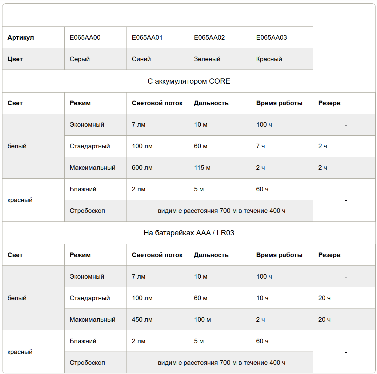 - три уровня белого освещения: максимальное время работы, средний режим (лучший баланс между мощностью и временем работы) и максимальная яркость